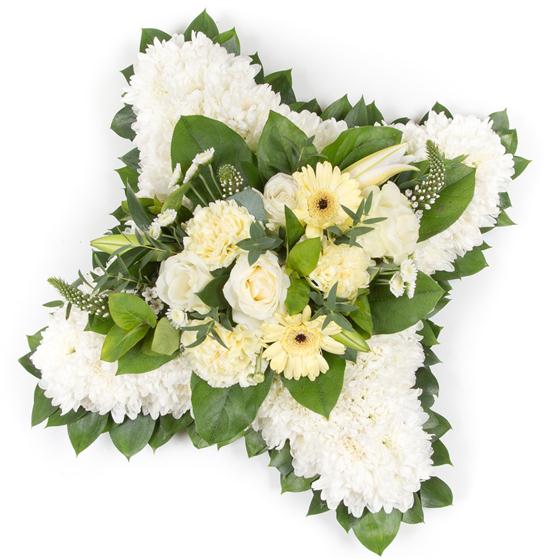 White chrysanthemums form the base of this traditional tribute. Available as pictured with a foliage edge or with a ribbon surround and spray in your choice of colours,15inch.