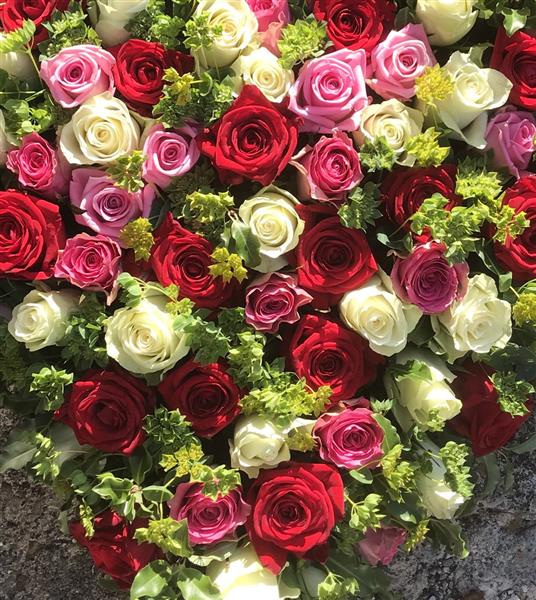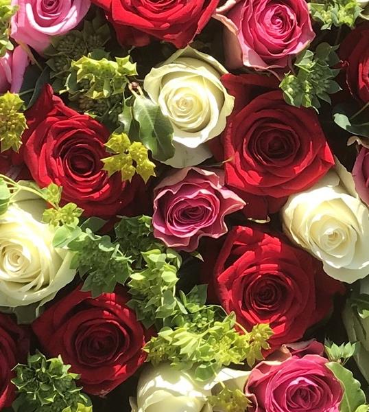 Mixed roses red, pink and white with mixed foliage.