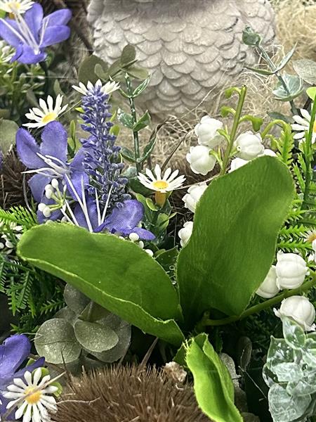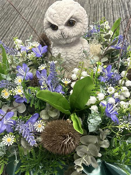 Owl resin tribute cushion posy a beautiful mix of artificial flowers and dried flowers.