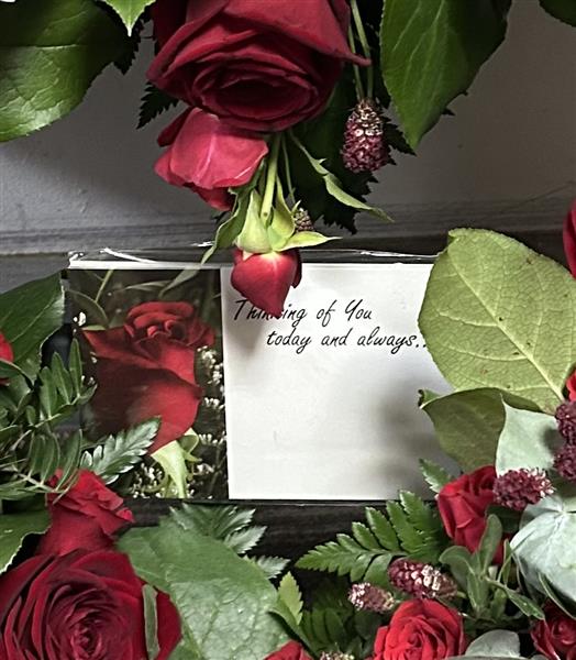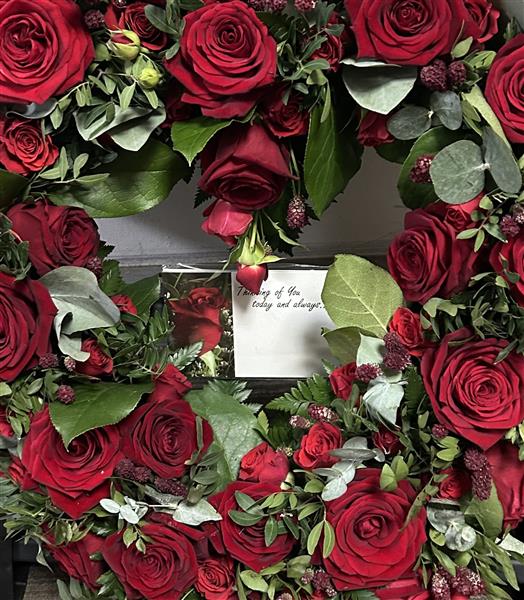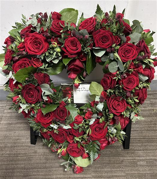 Beautiful Rose Heart made of various sized roses. And mixed foliages placed on a stand . Overall size approx 18 inch .