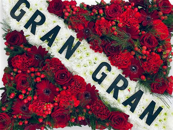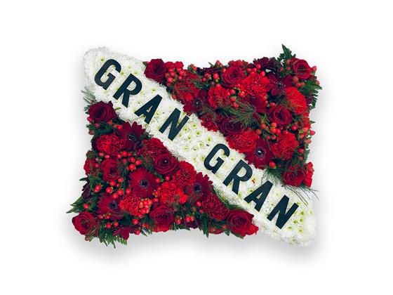 A large pillow, which a variety of loose flowers on two sides with a line of white chrysanthemums across the pillow. Wooden letters are placed on the chrysanthemums, you can select your word, please note it in the comments section. Please note you can use the maximum of 7 letters.