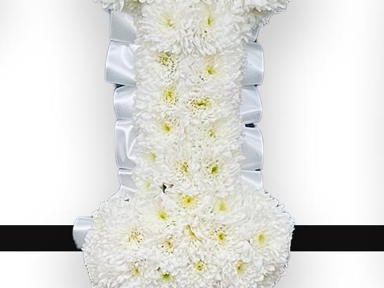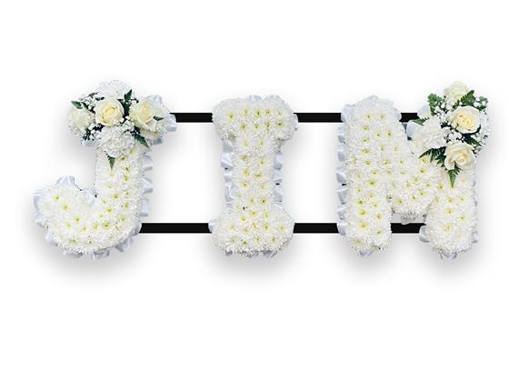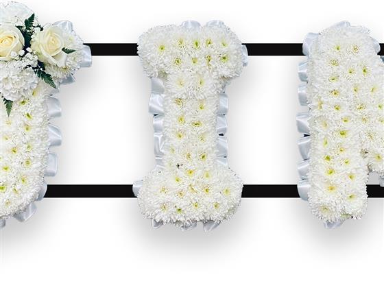 This letter tribute is massed in white chrysanthemums, white ribbon edging and has white corsage.