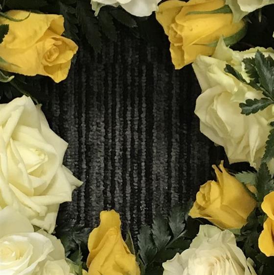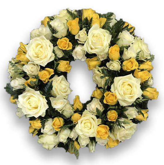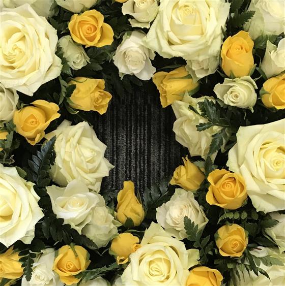 This is a wreath made of just roses white, ivory and yellow with foliage made on a 14 inch frame . Overall size 16 inches.