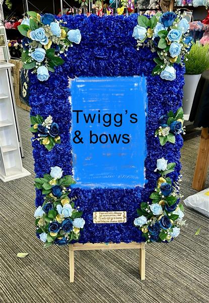 This Large photo frame is approx 3ft x2ft , Artificial carnations and Roses, placed onto an easel wooden stand. A ribbon sash can be added to the top of the photo frame.