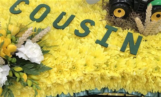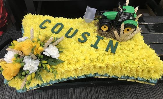 large pillow, with name required in wooden letters and a item of remembrance(tractor brought in by customer)