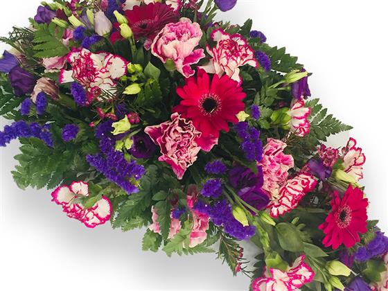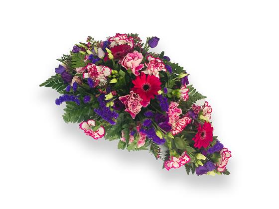 A tear drop spray, includes carnations, lizzy, gerbras and filler.