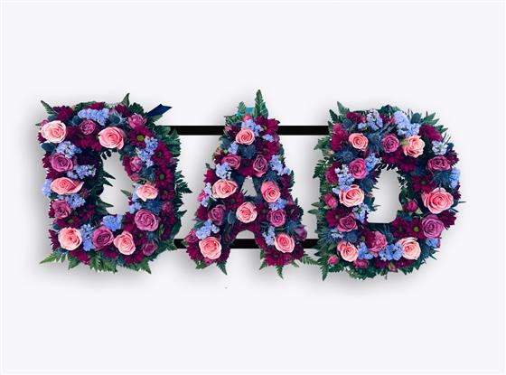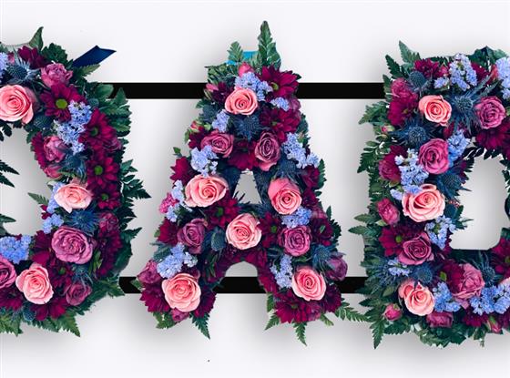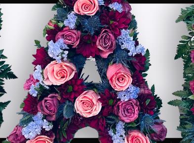 A lovely mixture of pinks with a hint of lilac. There is an assortment of flowers which include roses in the centre of the letters.