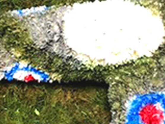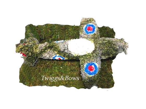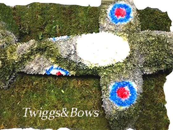 plane has been made of chrysanthemums and colours sprayed to requested colour (can be changed). the plane has been placed onto a foam 3ft board and covered with moss to give a ground affect,