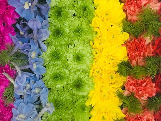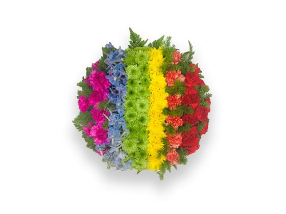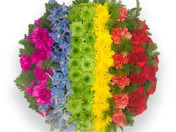 A colourful posy of mixed flowers, arranged like a rainbow.