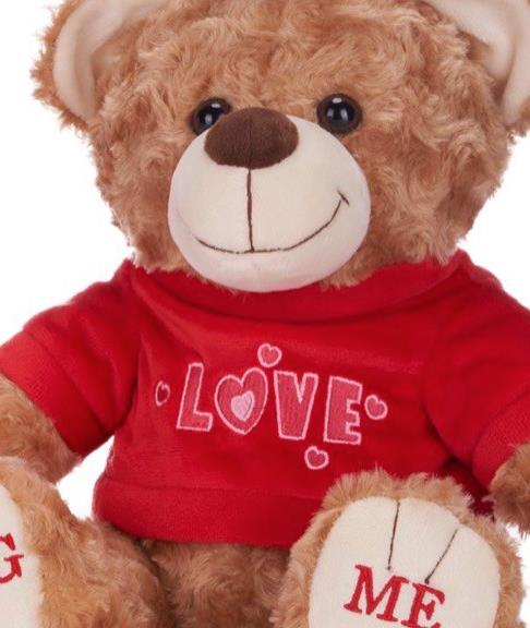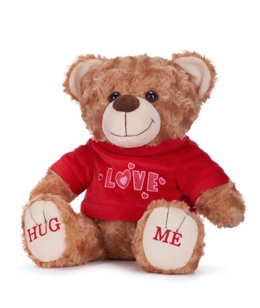 A sitting cuddly bear wearing a romantic red shirt with 'hug me' on its feet.