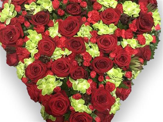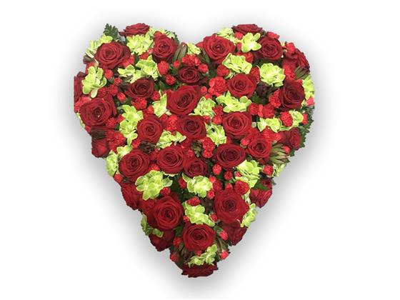 Tradional heart shaped design of Roses and carnations and complemented with seasonal filler, foliage.