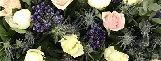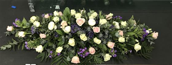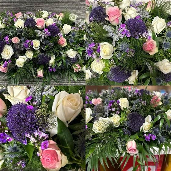 Displayed in picture is the 5ft casket spray of pink and white roses, blue erigium thistle, purple phlox and lilac Veronica, mixed seasonal foliage.