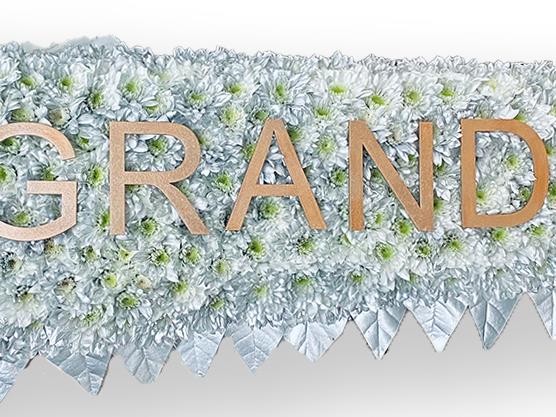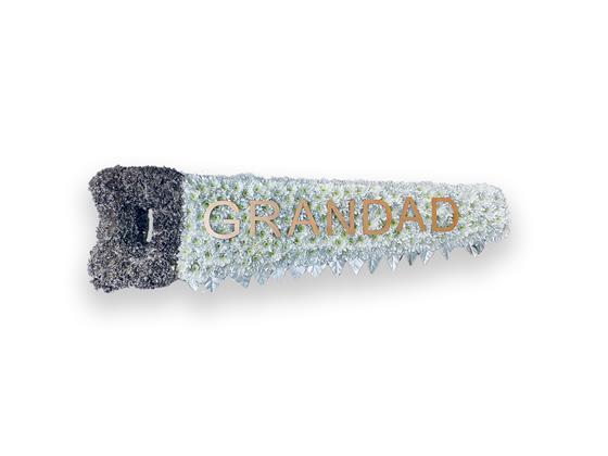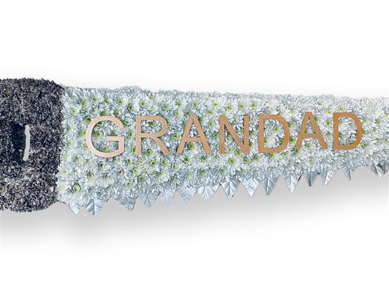 A 2D saw tribute which is massed in chrysanthemums and spray in colour, and the blades are made out of greenery. (Please note the wooden letters are not included in the price, but can be added.)