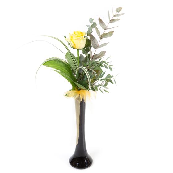 A single long stemmed yellow rose presented in a vase with mixed foliage sends a simple message.