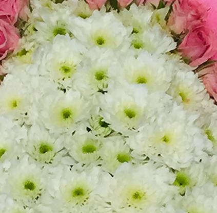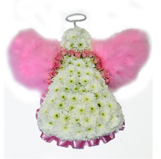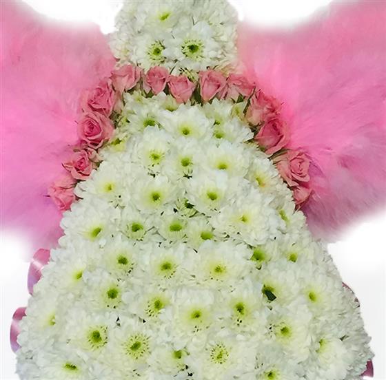 Small Angel massed white and pink spray roses as well as pink feathers for the wings, and a white halo.