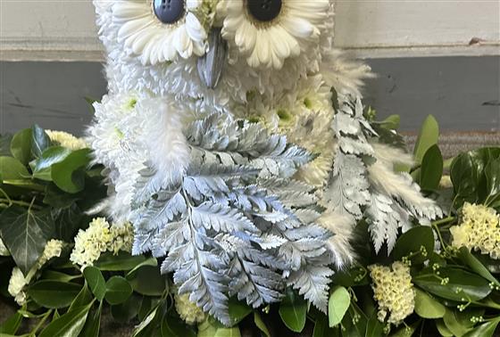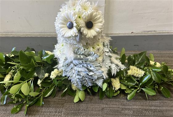 Snowy owl small petite owl on a foliage styled branch. Approx 18inch long