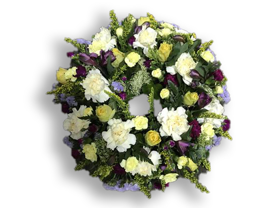 Standard 12inch wreath made of shades of spray carnations, carnations, statice, mixed foliage and filler.