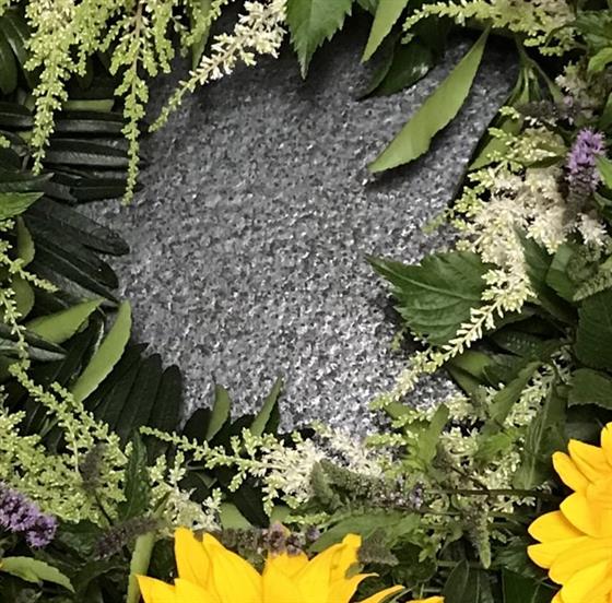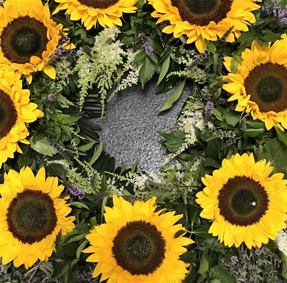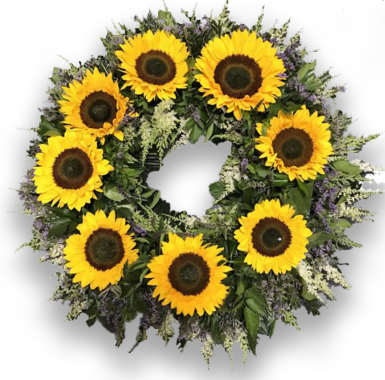 Large wreath displayed with large sunflowers, astilbe cream and lilac limonium and mixed foliage, please check sunflowers are in season or they will be substituted with large yellow gerbera . approx size 16-18 inches may vary
