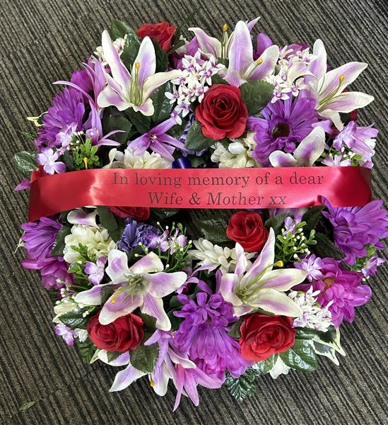 Silk Artificial wreath made with various sized artificial lilac purple flowers and red roses. Overall size approx 18 inch. Sash can be changed