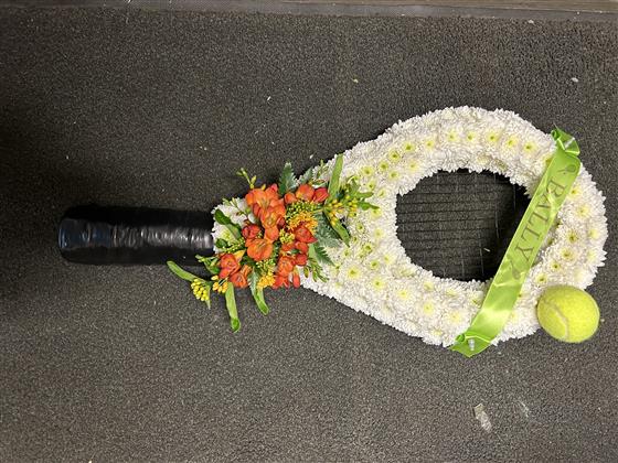 A tennis racket tribute, based on white chrysanthemum small corsage above the handle. Size 30cmx 60cm. With a name sash included and tennis ball.