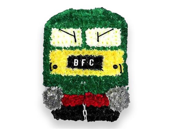 Flat based front on train, based chrysanthemums and sprayed to make the train affect with added trims. Approx 24x24”
