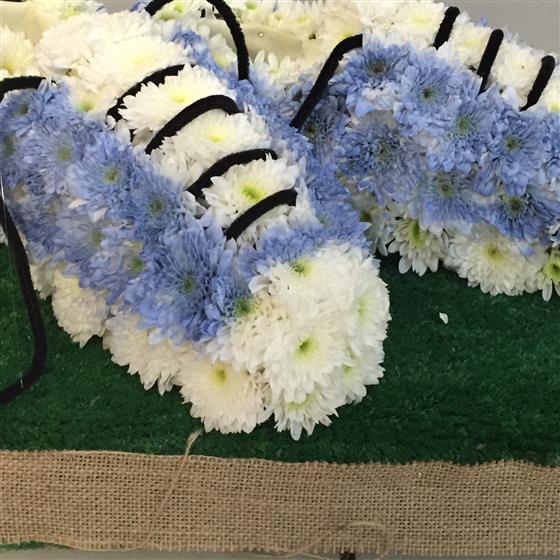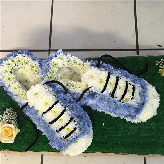 the trainers have been placed on a 2ft artifical grass board, 2 small corsage spray in corners, the trainers approx 10-11 inch in size, colours can be changed.