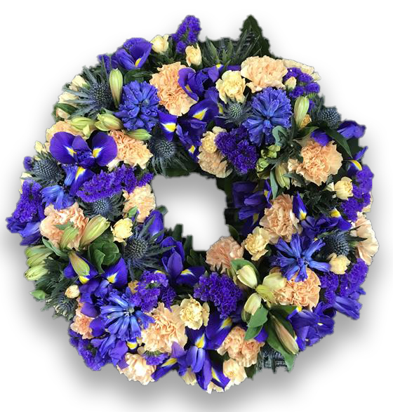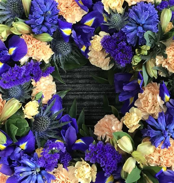 Wreath full of iris in bloom with a splash of peachy/orange carnation , includes thistle mixed foliage and filler.