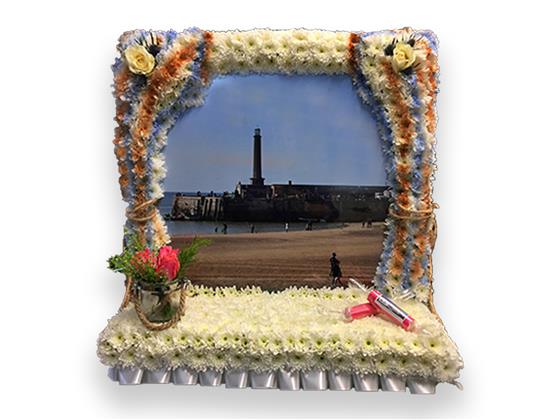 the frame has been ribbon edged the photo has been laminated andplaced into the window frame, curtains and draw back ties, etc to give it the window affect have been added.approx size 24" x 24 "