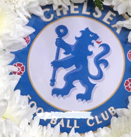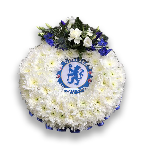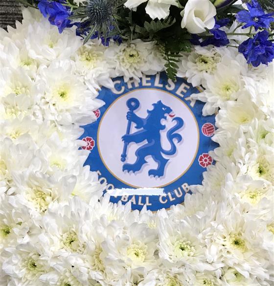 Chelsea Football wreath, massed white base with blue/white spray of flowers, blue ribbon edge with laminated badge in the centre.