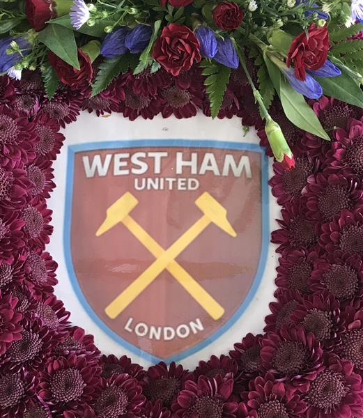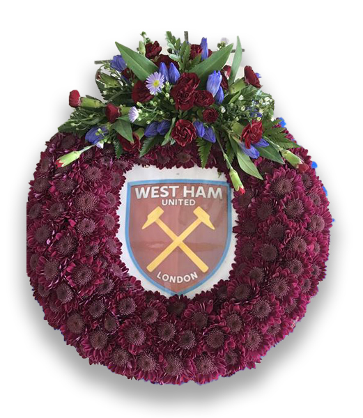 West ham football wreath, based wreath with a blue and burgundy corsage spray.due to the colour this is more expensive than the standard football wreaths.