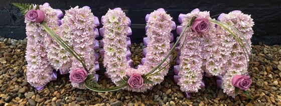 This is approx. 3ft in size, the floral based flowers have been made in lilac pink flowers with a single lilac rose placed on lettering