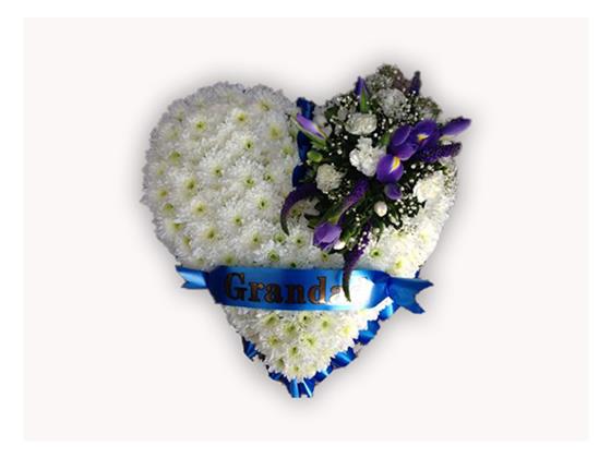 heart ribbon edged blue, based with white and a blue and white corsage spray of flowers,