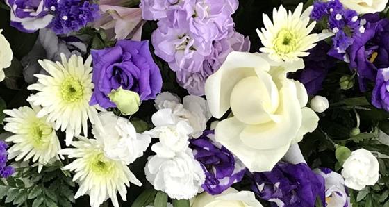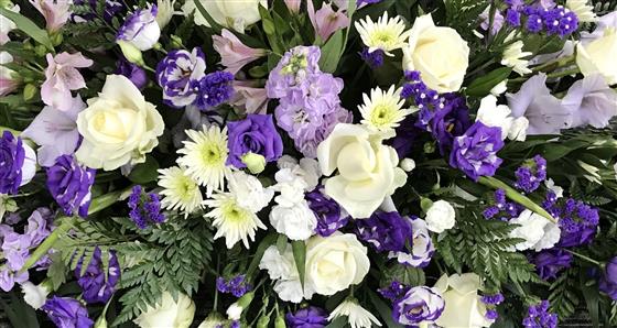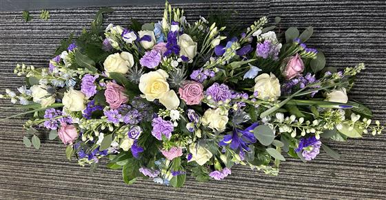 A beautiful caskets spray of shades of lilac, purples and hint of white , seasonal flowers Will be selected.