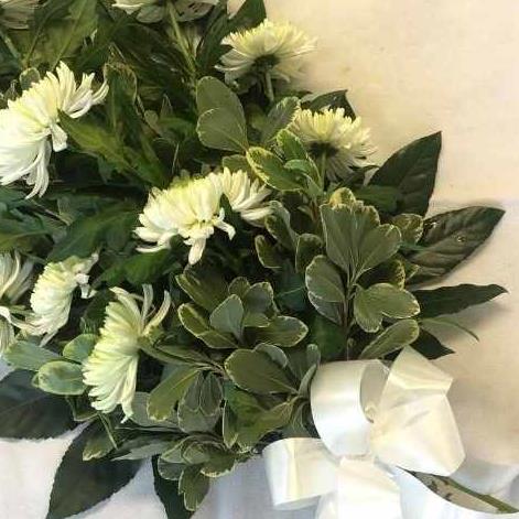 a simple but beautiful spray of white bloom chrysanthemums with a mixed display of foliage